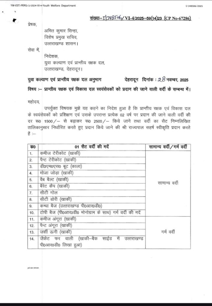 प्रान्तीय रक्षक एवं विकास दल (पीआरडी) स्वयंसेवकों के लिए वर्दी भत्ते में वृद्धि की गयी है। अब वर्दी भत्ते के लिए हर 2 साल में ₹1500 के बजाय ₹2500 दिए जाएंगे। सर्दी और गर्मी के अलग-अलग यूनिफॉर्म सेट भी तय कर दिए गए हैं। उत्तराखंड के युवा कल्याण मंत्री रेखा आर्या ने इस निर्णय का स्वागत करते हुए कहा कि प्रदेश सरकार पीआरडी स्वयंसेवकों के हित के लिए लगातार काम कर रही है। वर्दी भत्ते में यह वृद्धि उनके समर्पण और सेवा को सम्मान देने का प्रयास है। उन्होंने कहा कि चार धाम यात्रा समेत विभिन्न अवसरों पर पीआरडी स्वयंसेवकों ने शानदार काम किया है।